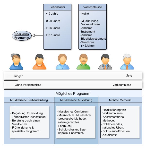 Zu Bedenken ist dabei auch, ob und welche Vorkenntnisse (noch) bestehen. Viele sind in der Jugend von Trompete auf Horn umgestiegen oder haben einige Jahre Horn gelernt. Hier ist es wichtig, die nützlichen Fähigkeiten zu reaktivieren, aber evtl. „bad habits“, also kontraproduktive Vorgehensweisen, von Beginn des Wiedererlernens zu eliminieren. Das ist nicht einfach, denn alte Erinnerungen sind häufig sehr fest im Gedächtnis verdrahtet. Die McAfee Methode widmet ein ganzes Kapitel der Vorgehensweise bei der „Neuprägung“ von nützlichen und hilfreichen Techniken beim Horn lernen.